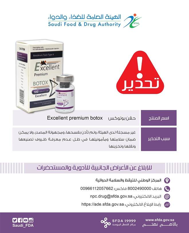 نشرت الهيئة العامة للغذاء والدواء السعودية بيانا رسميا على موقعها الالكتروني تحذر من خلاله من حقن البوتوكس التي تحمل اسم Excellent premium botox.