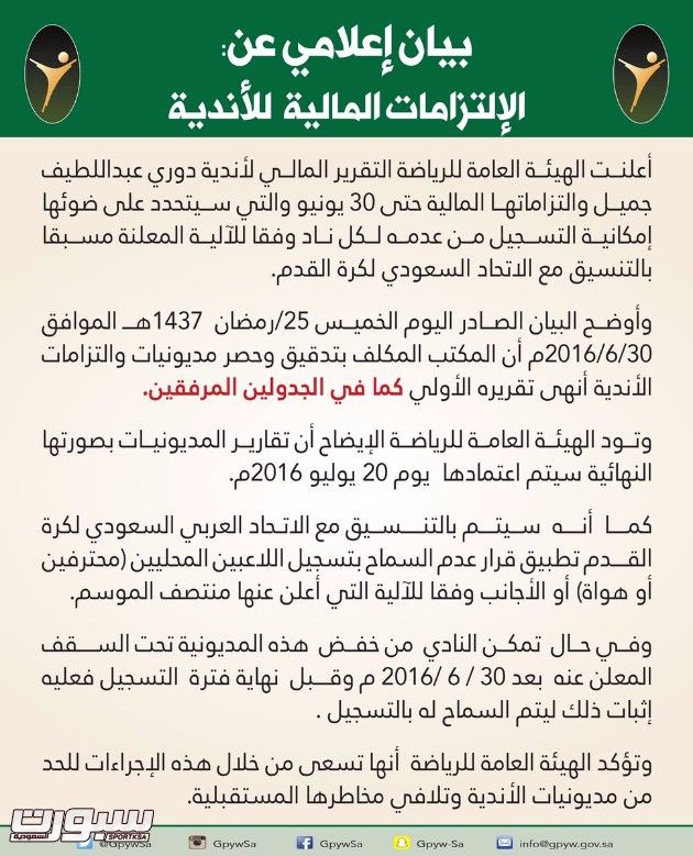 اعلنت الهيئة العامة للرياضية مديونيات الاندية السعودية واحقيتها بالتسجيل وفقا لجدوال وبيانات المديونيات وحددت الهيئة تاريخ 20 يوليو لاستكمال البيانات ليتحدد على ضوئها امكانية التسجيل للاجانب والمحليين من