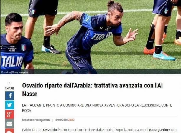 نشر موقع “فانتا غازيتا” الإيطالي خبراً عن دخول نادي النصر في مفاوضات متقدمة مع اللاعب الإيطالي بابلو أوزفالدو، للتعاقد معه الموسم المقبل، بنظام الإنتقال الحر، بعد قيام ناديه