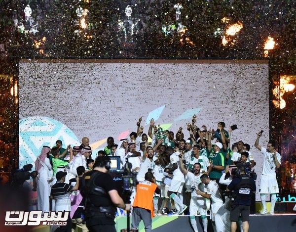 توج رئيس الاتحاد السعودي لكرة القدم أحمد عيد الحربي رئيس وأعضاء ولاعبي فريق كرة القدم بالنادي الأهلي بكأس دوري المحترفين السعودي والميداليات الذهبية بمناسبة حصول الفريق الأول بالنادي