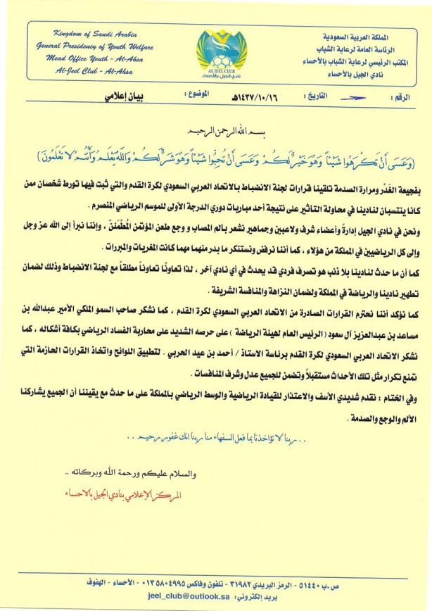 تبرأ نادي الجيل من منسوبي النادي الذين شملتهم قرارات الاتحاد السعودي اليوم والمتعلقة بإنزال الفريق الاول